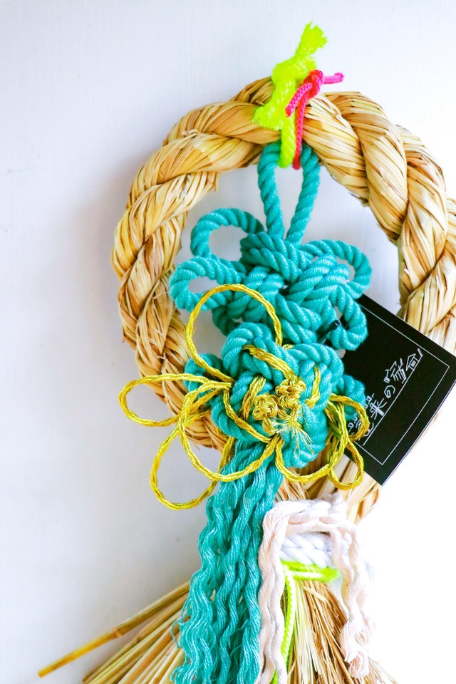 \ あかねさんの祝飾り! / ※店頭でも同時販売中 あかねさんが作った飾り結をあしらった、蓬莱の家流の祝飾りです。 藁で力強く編まれた輪に、鮮やかなブルーの結び飾りと多色の紐を重ねた祝飾り。 素朴な自然素材に、ポップな色彩と立体的な結びが加わり、伝統的でありながらどこか自由な表情を生み出しています。 新年の玄関や室内に、明るく前向きな空気を運ぶ一点です。 年中飾りとしてもお楽しみいただけます。 ※モニターと実物で色合いが異なる場合がございます。予めご了承ください。 サイズ 縦(紐含む):約65cm、横:約24cm、厚さ:約5cm 発送まで1週間程度いただきます。
