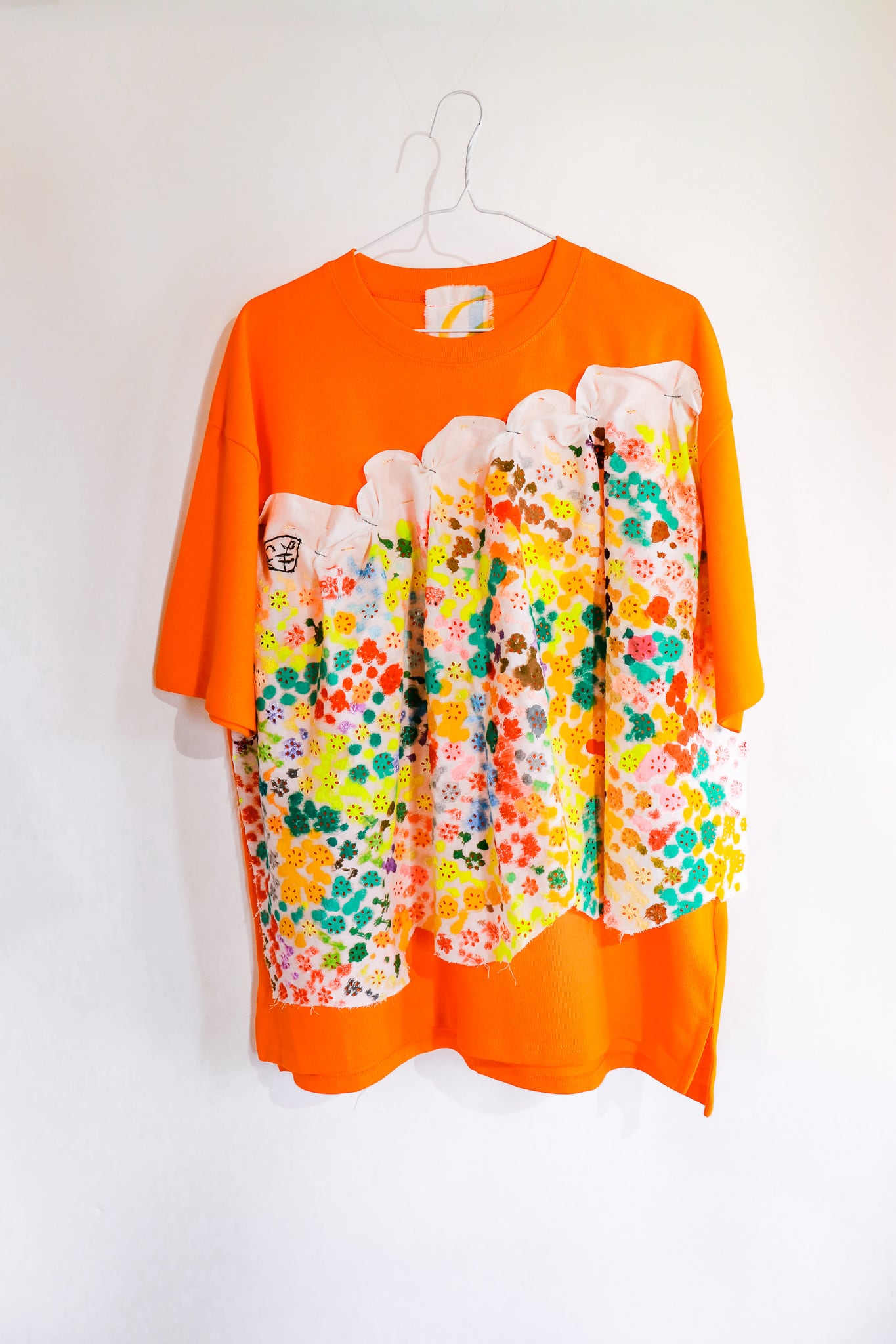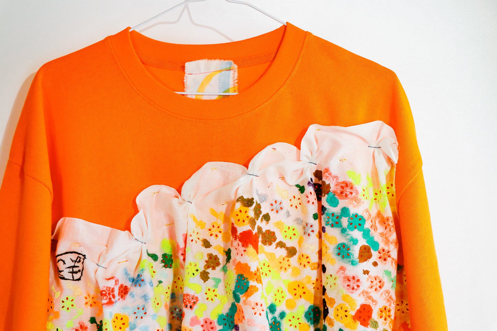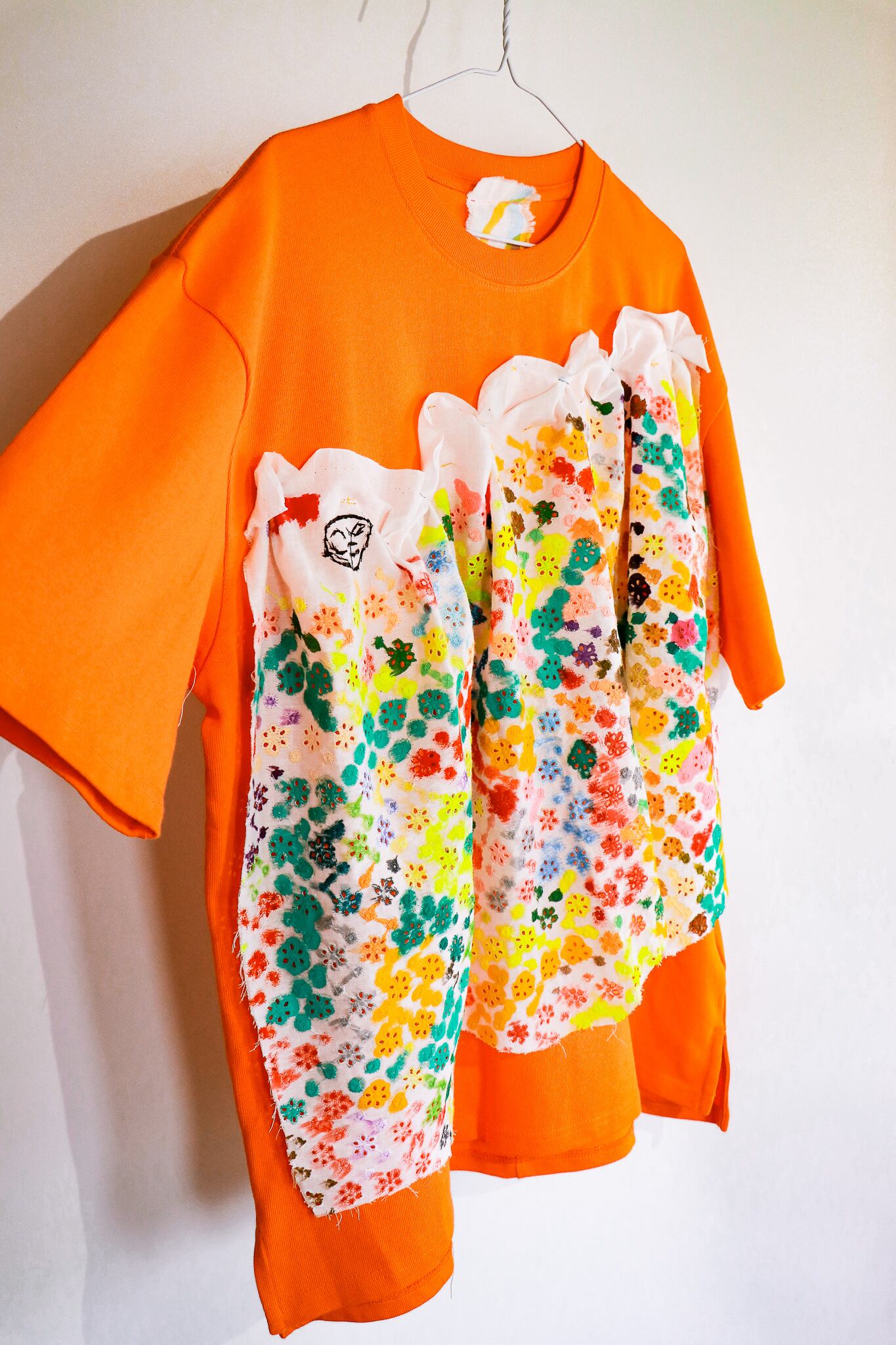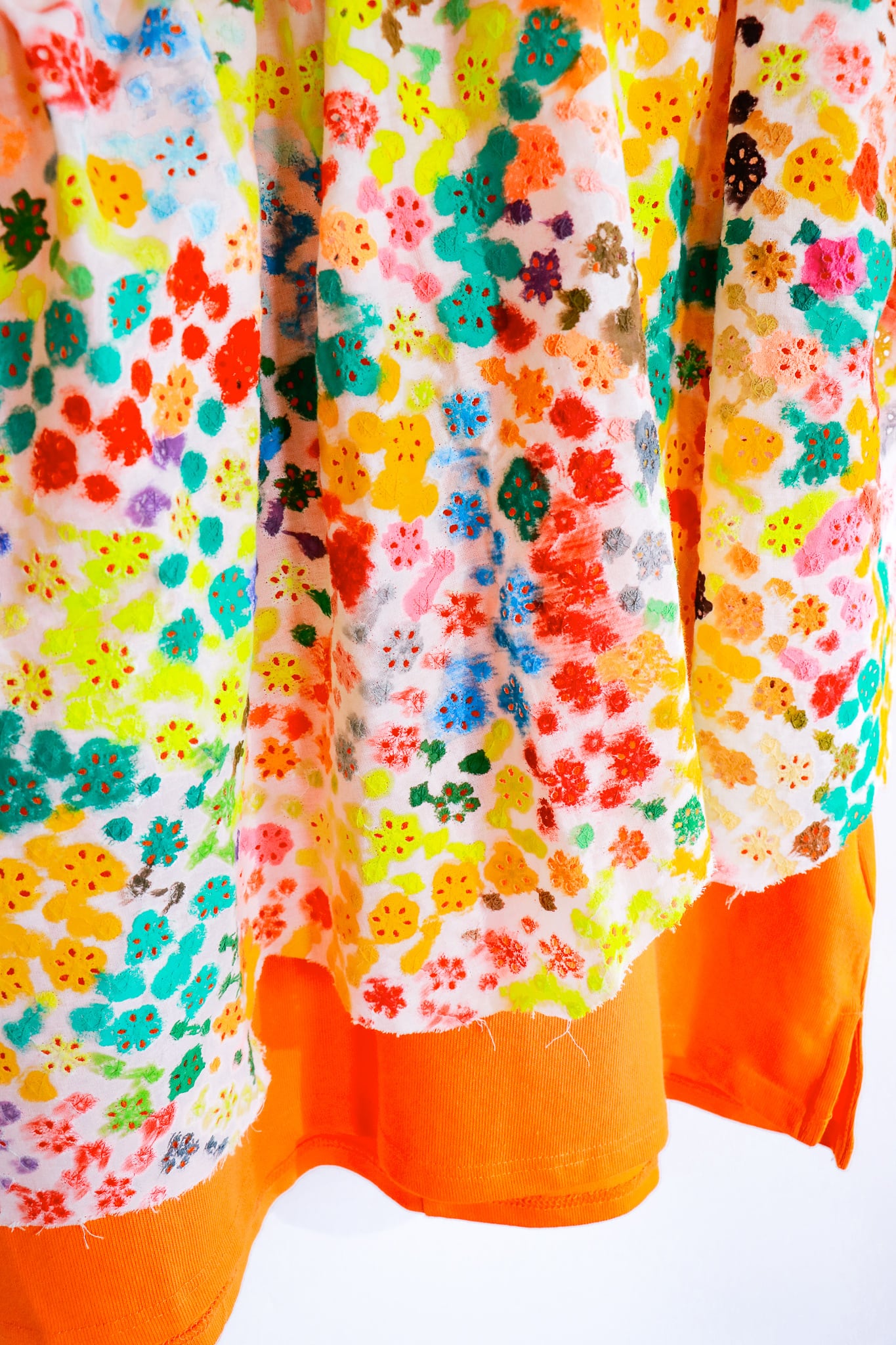 胸元から裾にかけて施された布は、やわらかなひだと色彩の重なりで動きのある表情を生み出し、まるで花畑を纏っているような華やかさ。