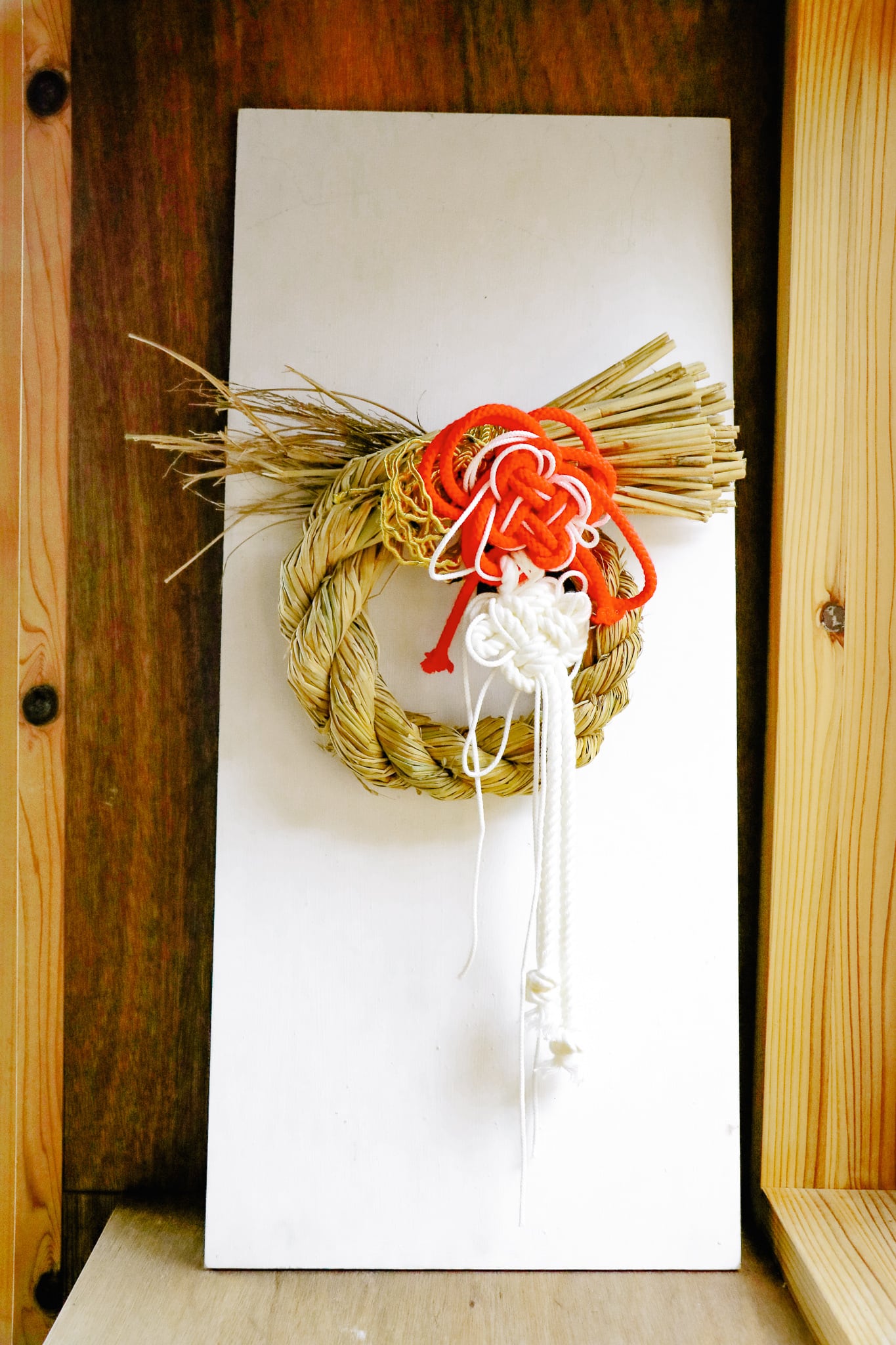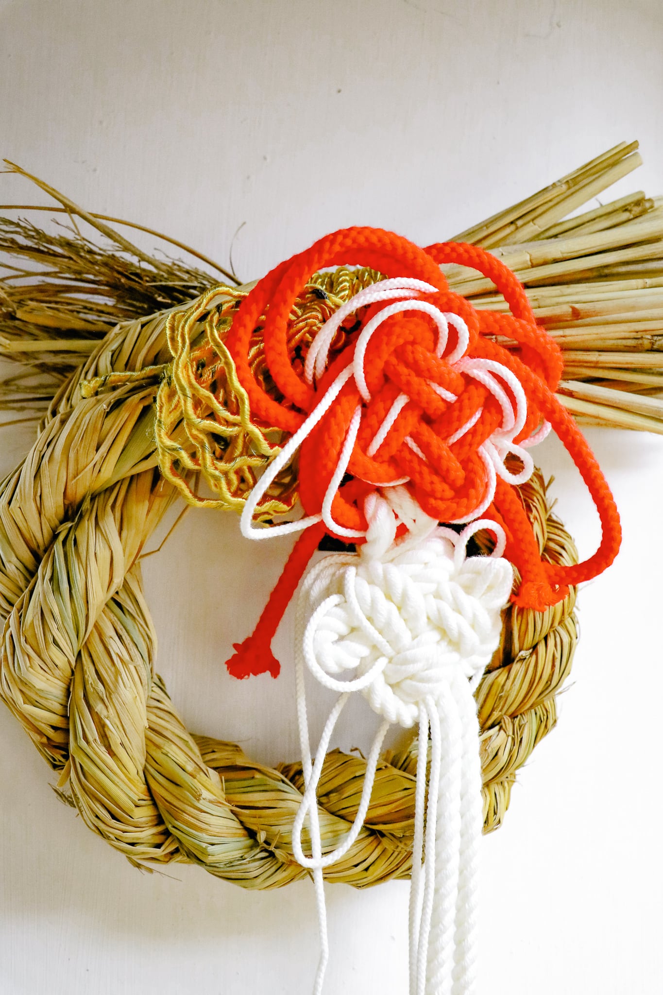 自然素材のしめ縄に、朱色と白の結び飾りを組み合わせた祝飾りです。