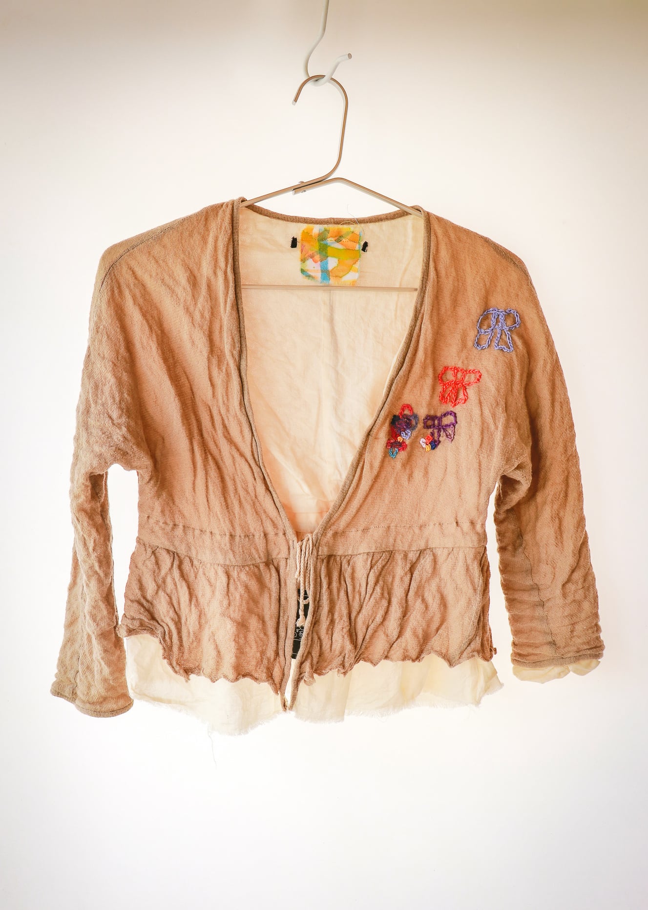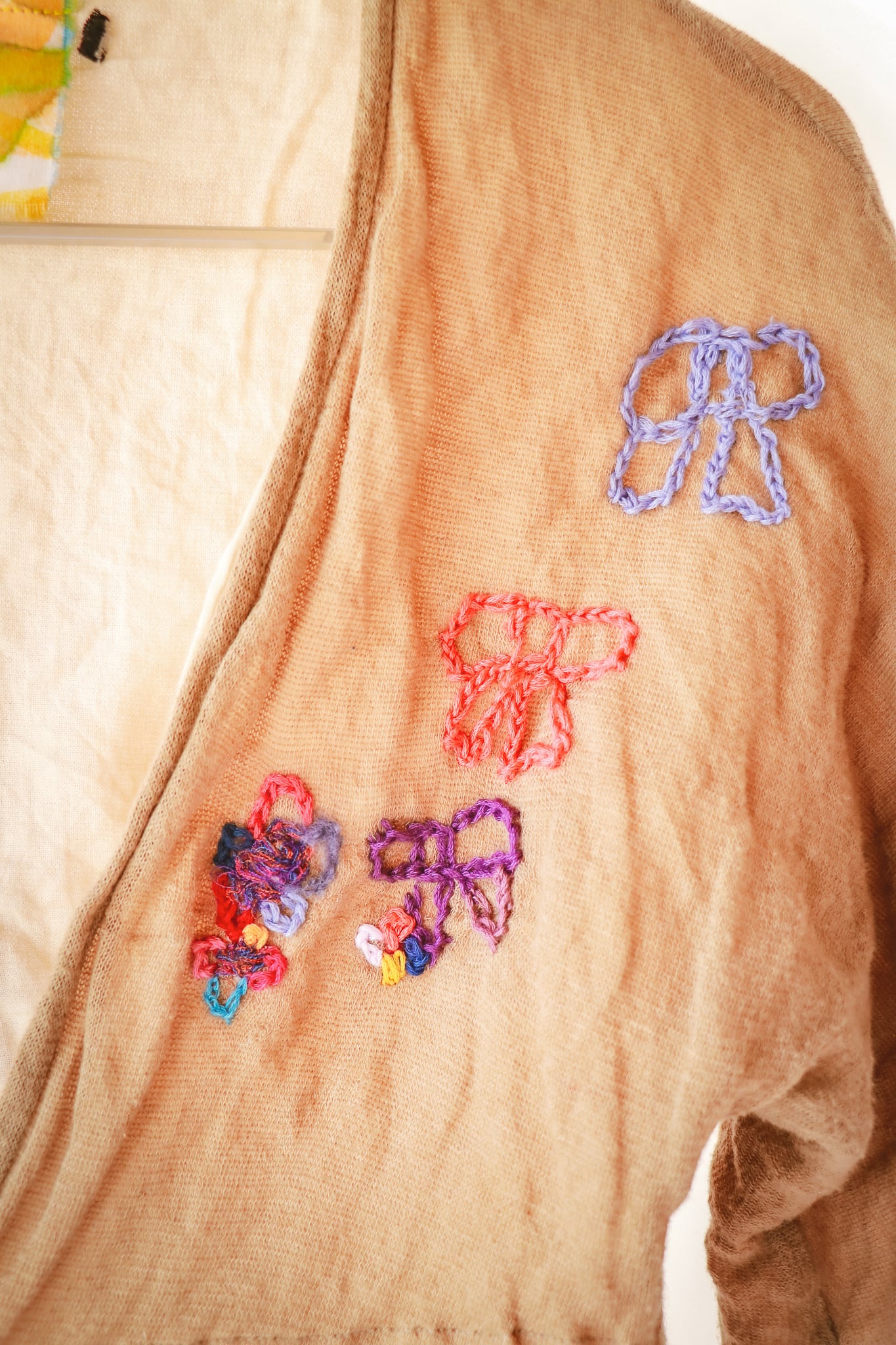 柔らかな素材のカーディガンに可愛らしいりぼんの刺繍が施された一点物です。