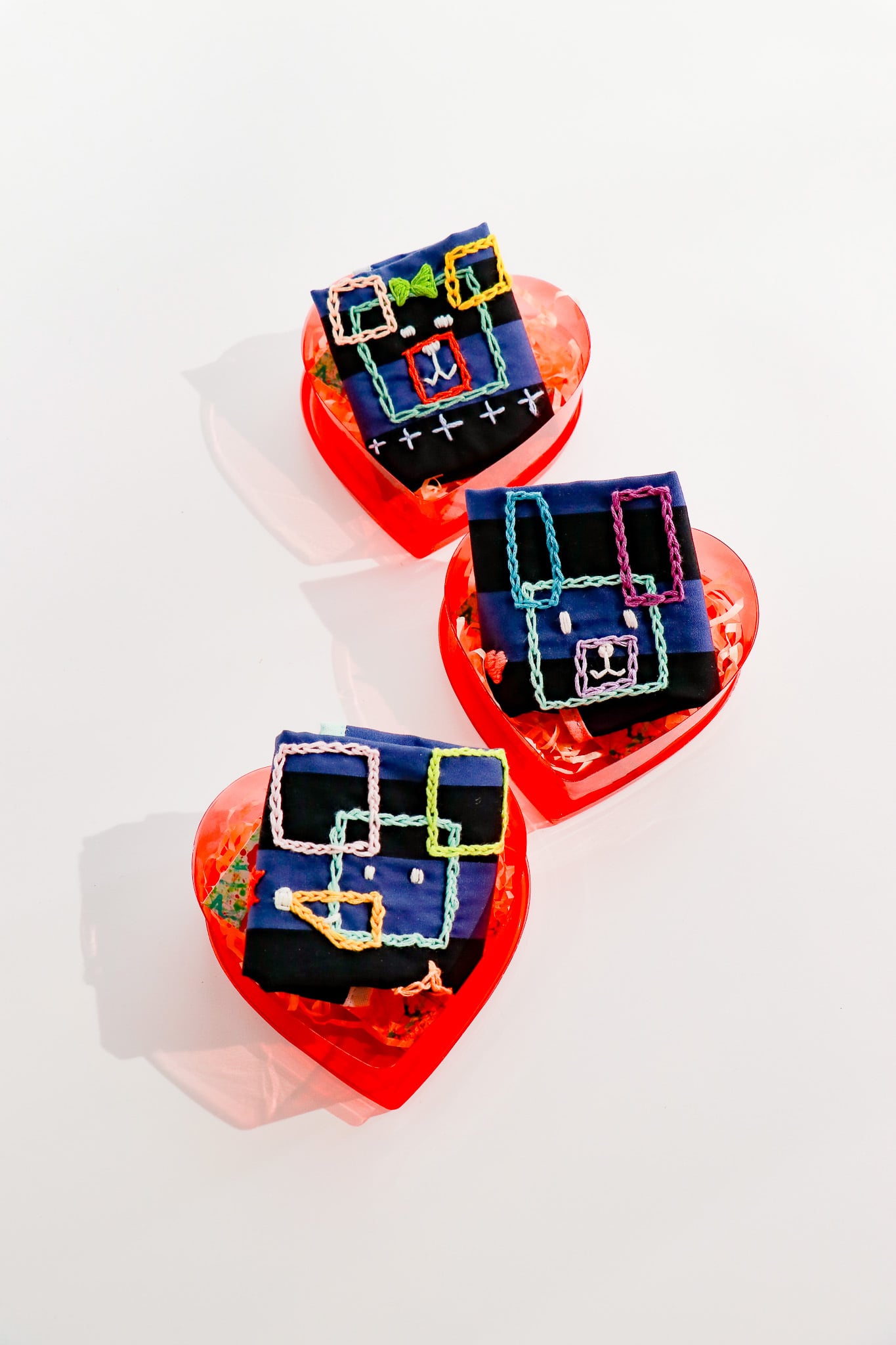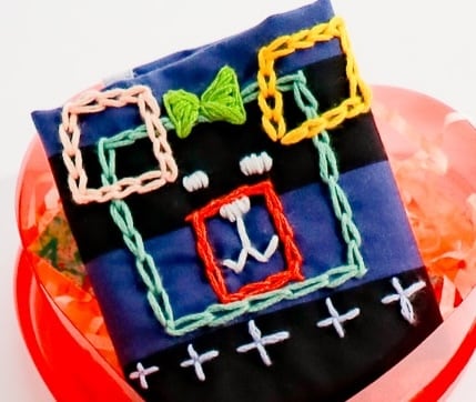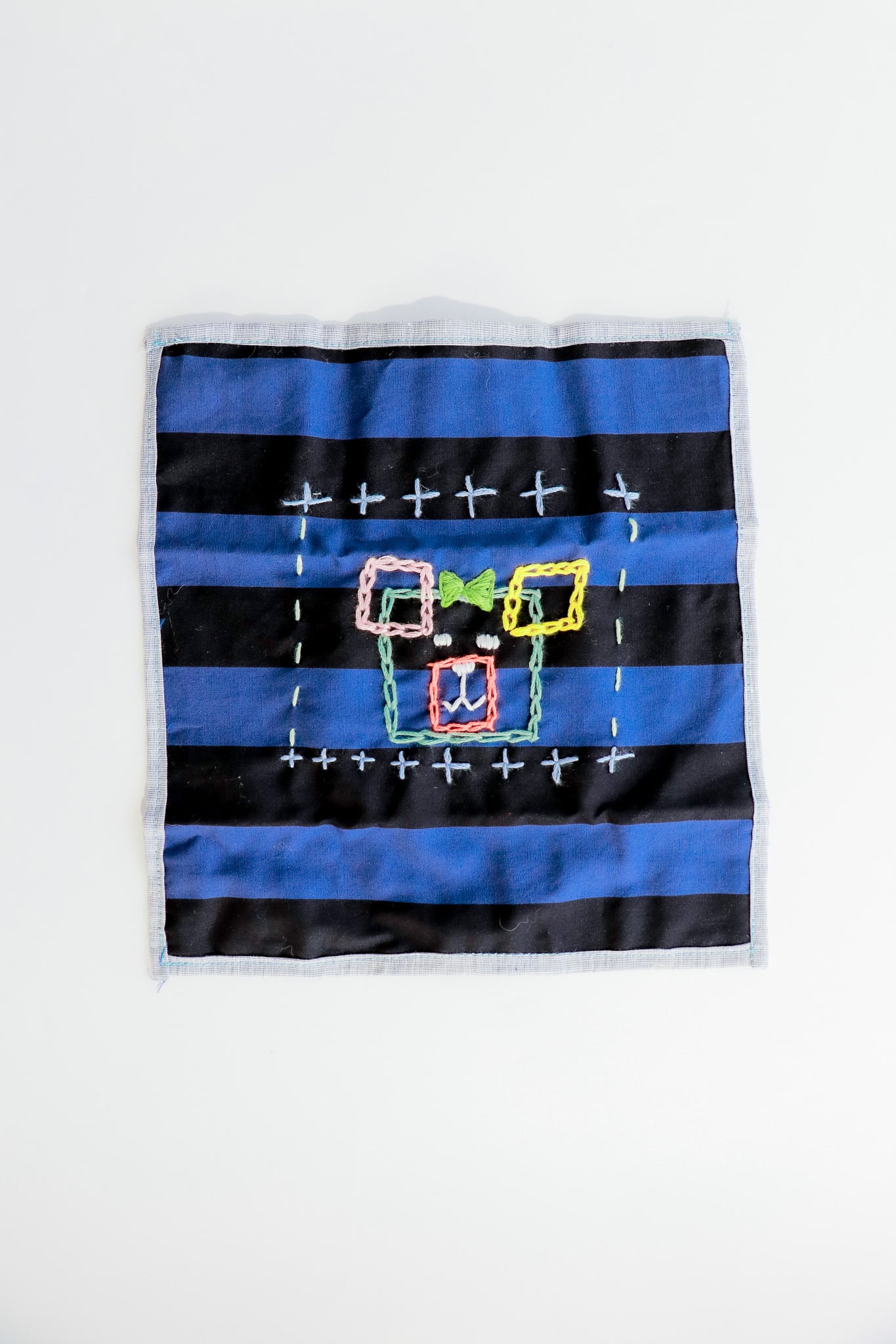 四角いかたちを組み合わせたユーモラスな表情と、周囲に散りばめられたステッチ模様が、作品全体にリズムを生み出しています。