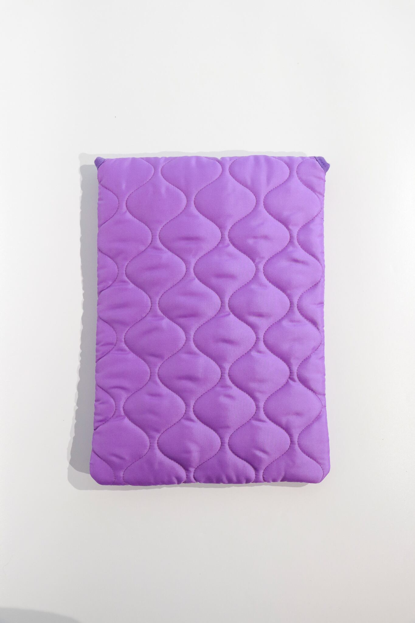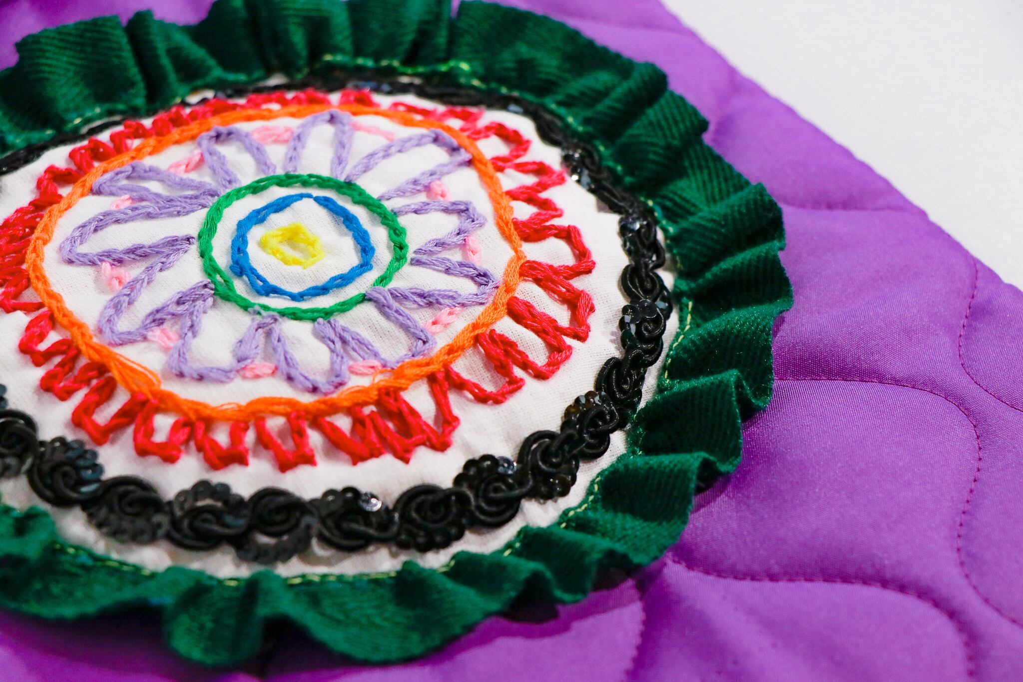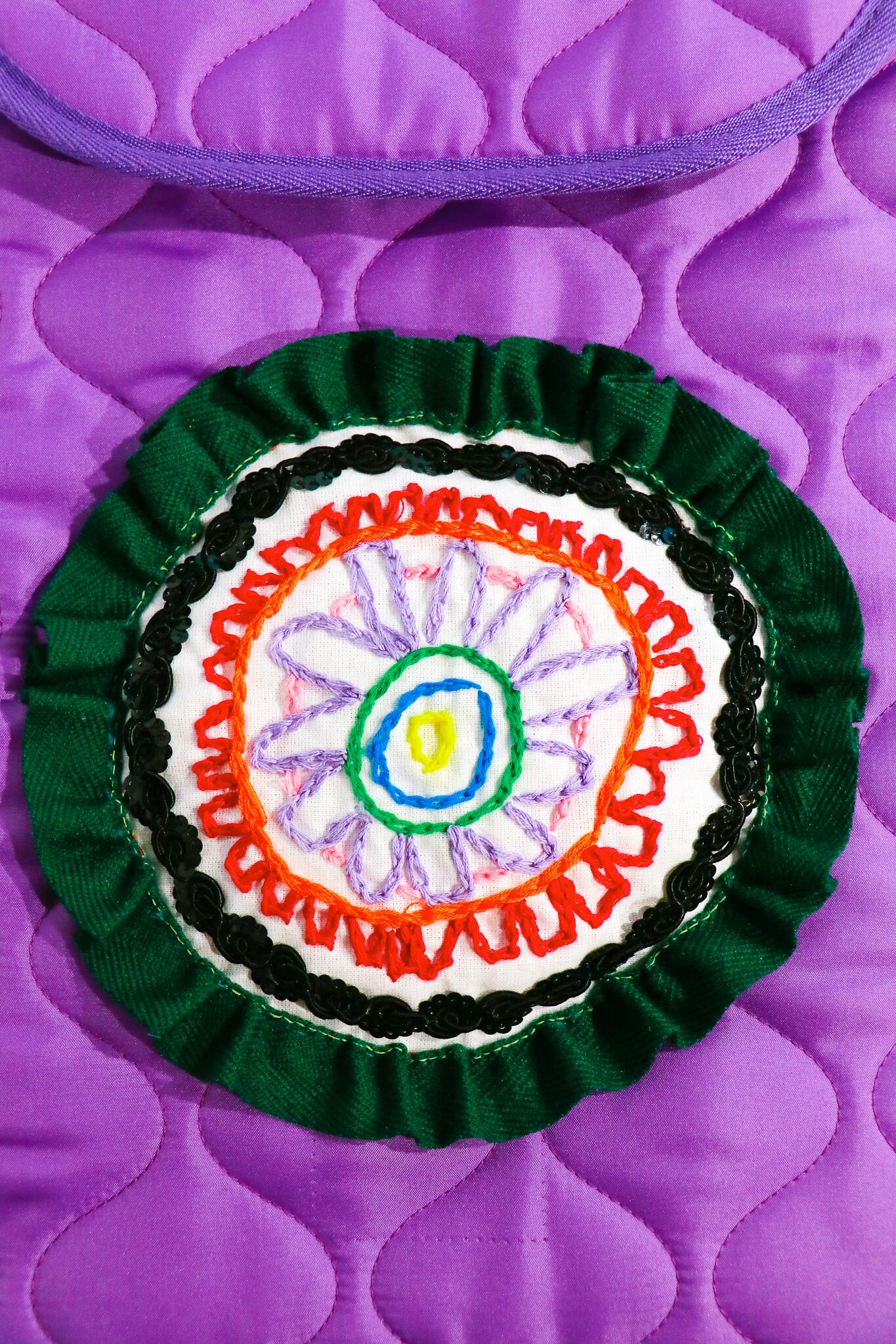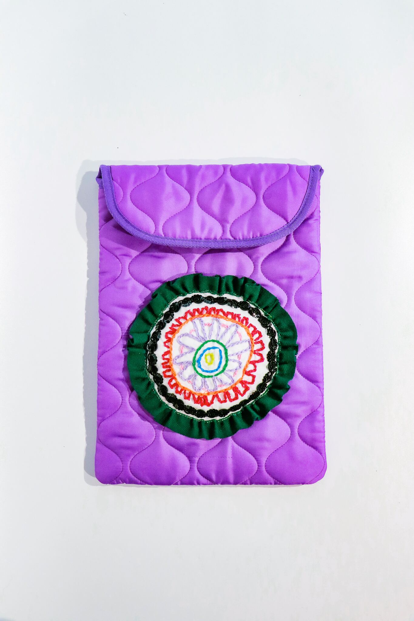 鮮やかなパープルのキルティング生地に、さかもとさんによる円形の刺繍モチーフを重ねたタブレットケース。