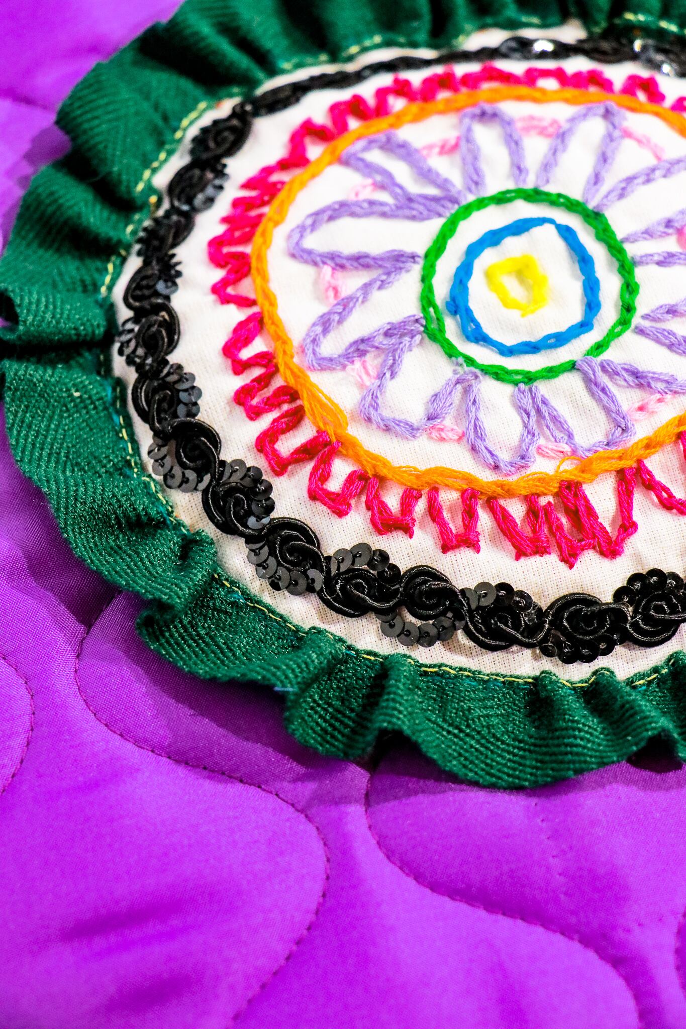 フリルやステッチを幾重にも重ねた刺繍は、花のようにも、模様のようにも見え、見る角度や気分で印象が変わります。