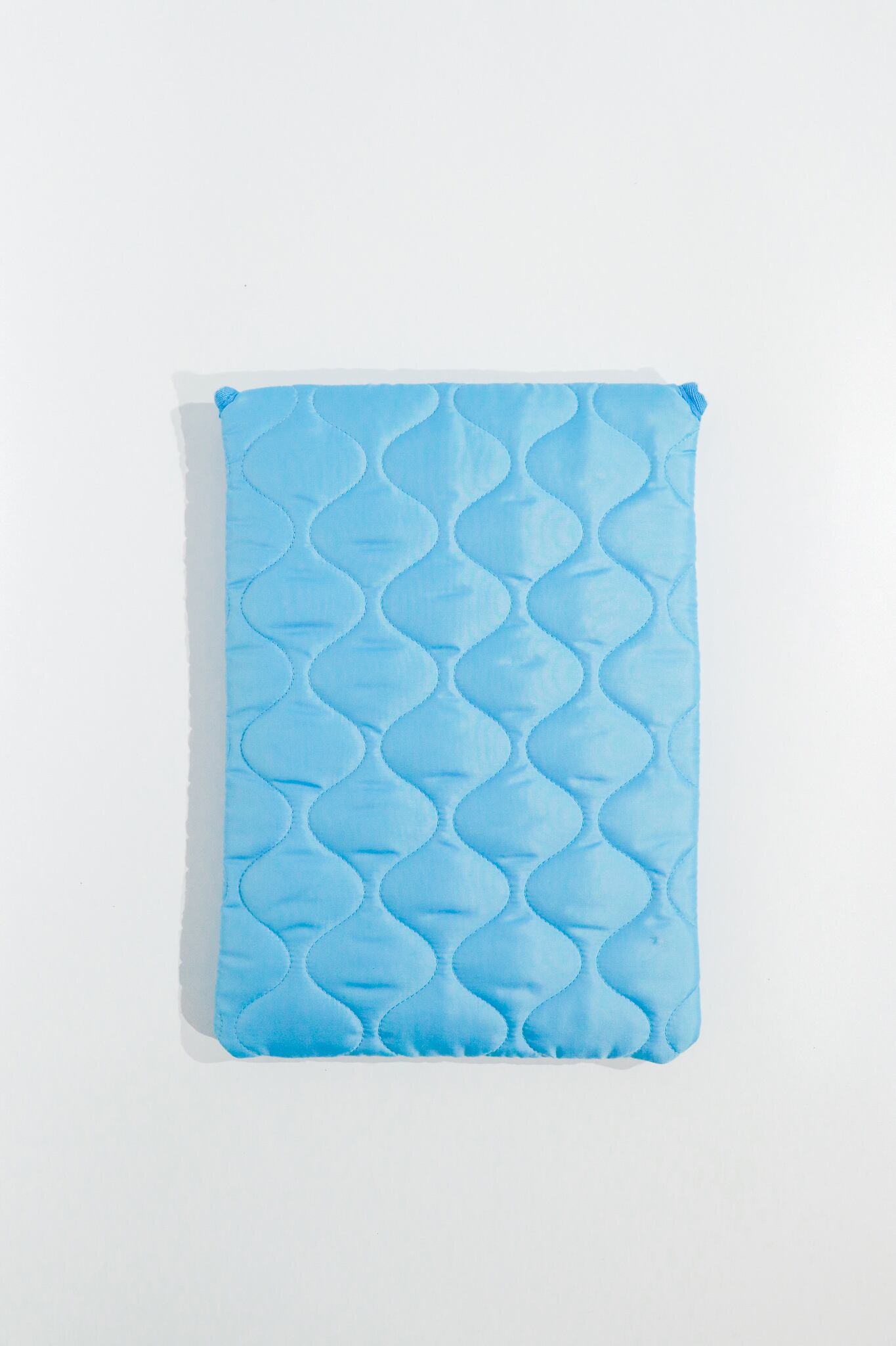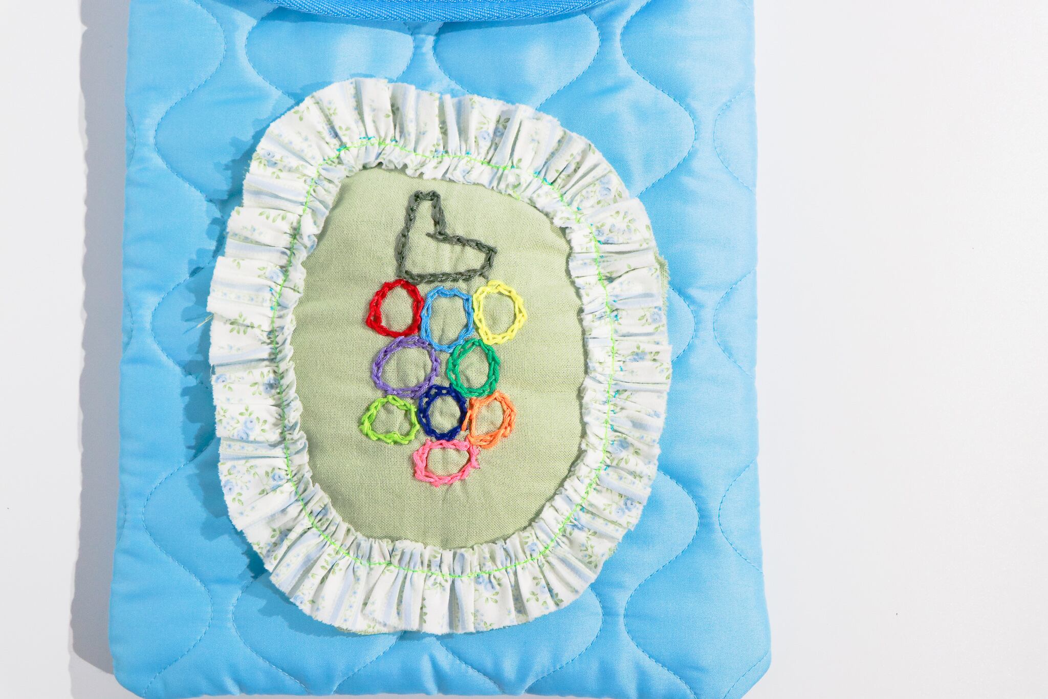 爽やかな水色のキルティング生地に、さかもとさんのカラフルなぶどうの刺繍モチーフをあしらったタブレットケース。