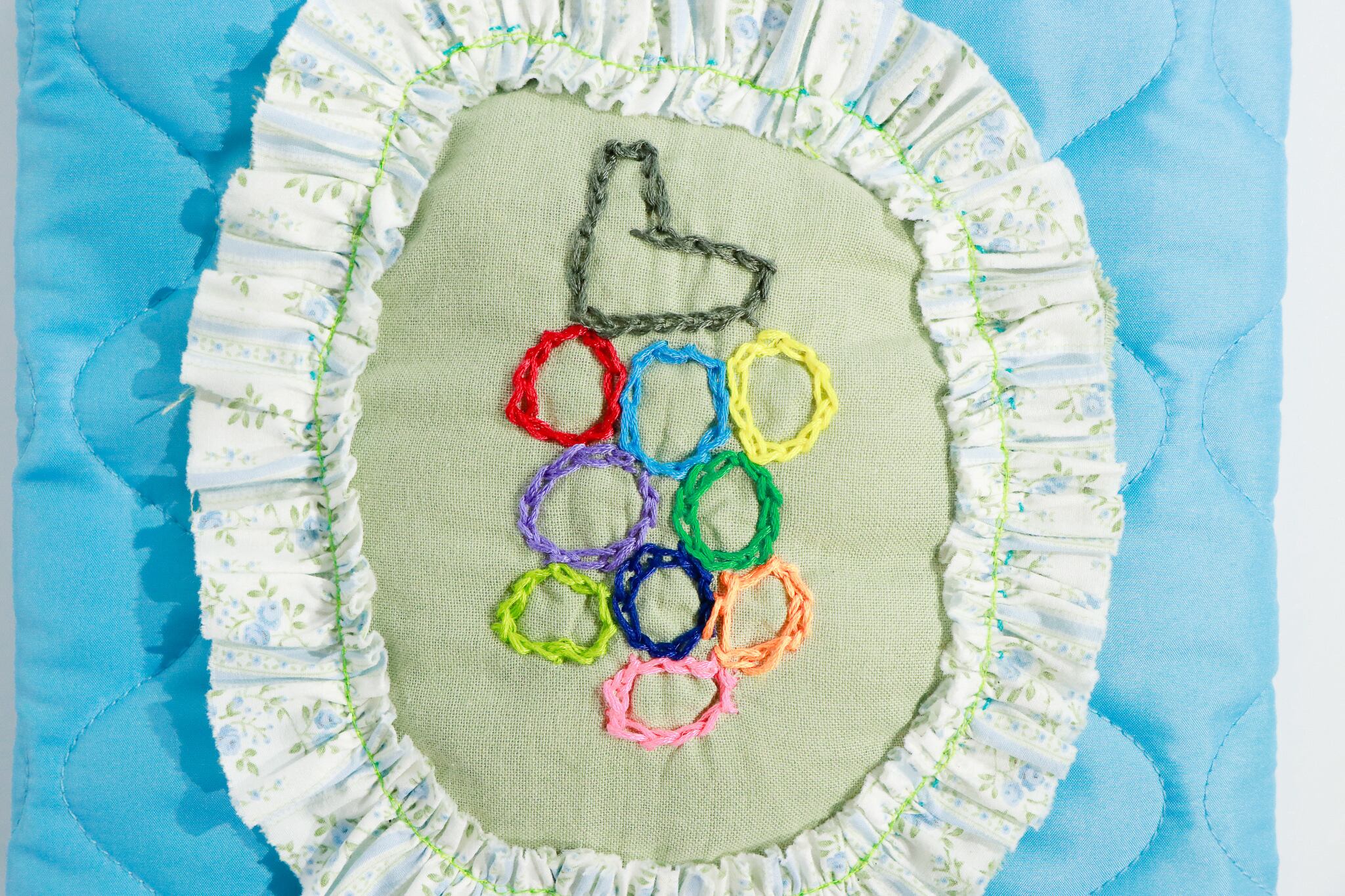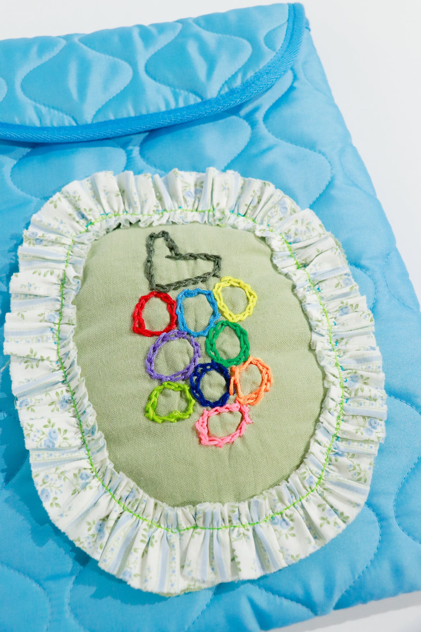 フリルで縁取られた中央の刺繍は、一粒一粒重なる色糸と、素朴な線が印象的。