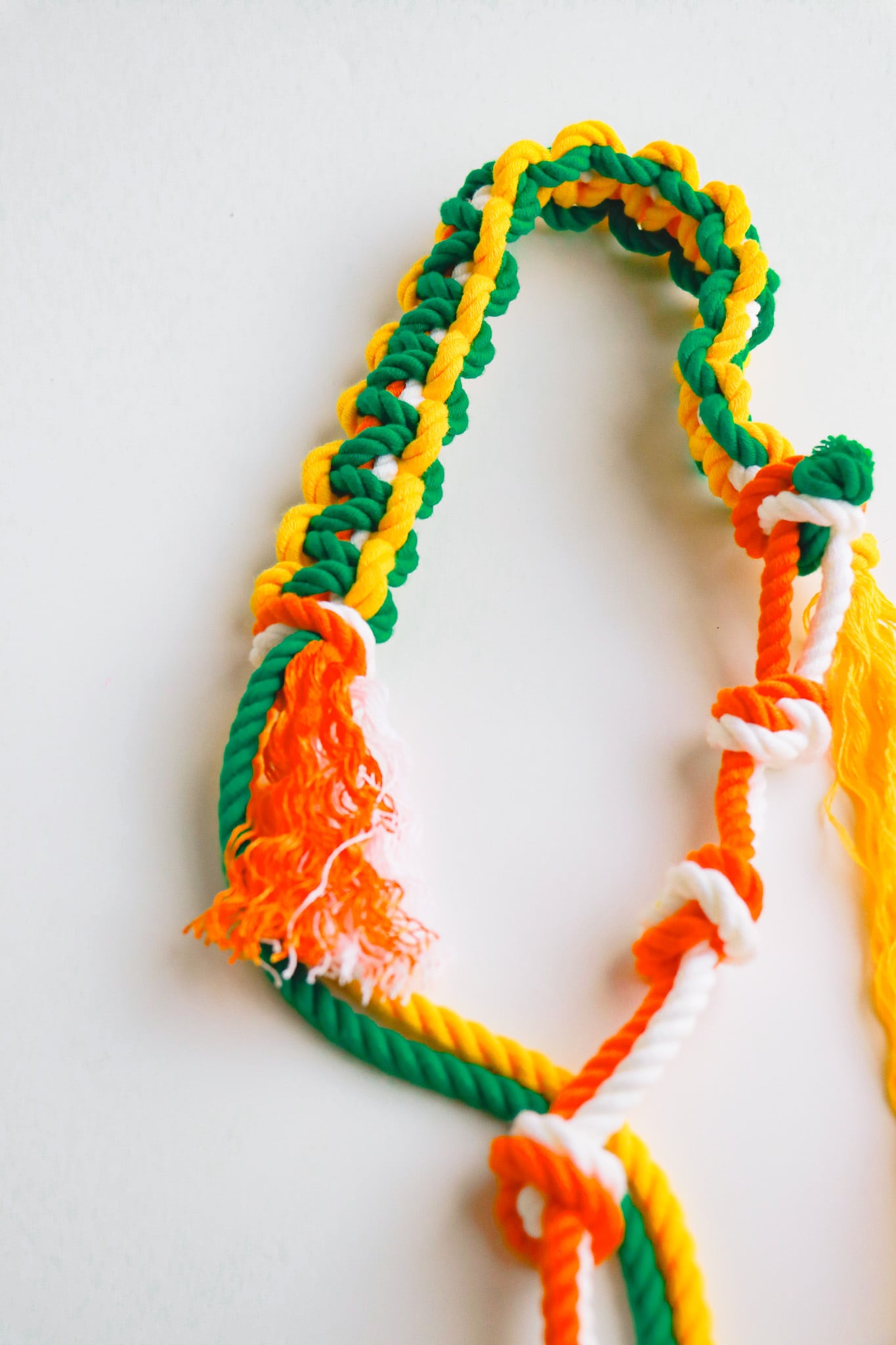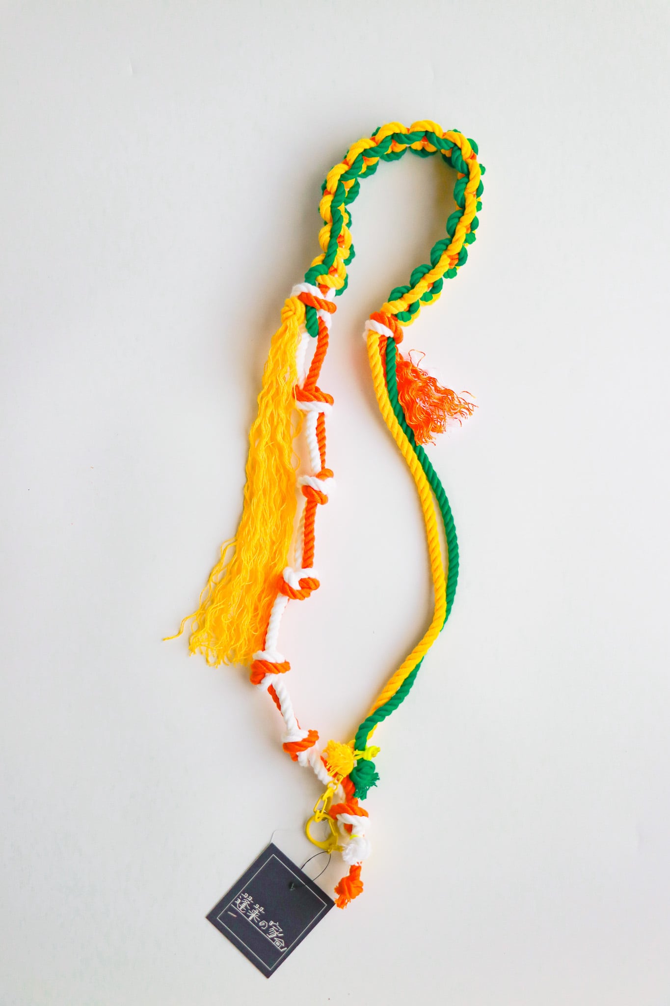 ロープを編み込んだ立体的なデザインと、ところどころに結ばれた紐やフリンジがアクセントになり、元気で楽しい雰囲気をつくり出しています。