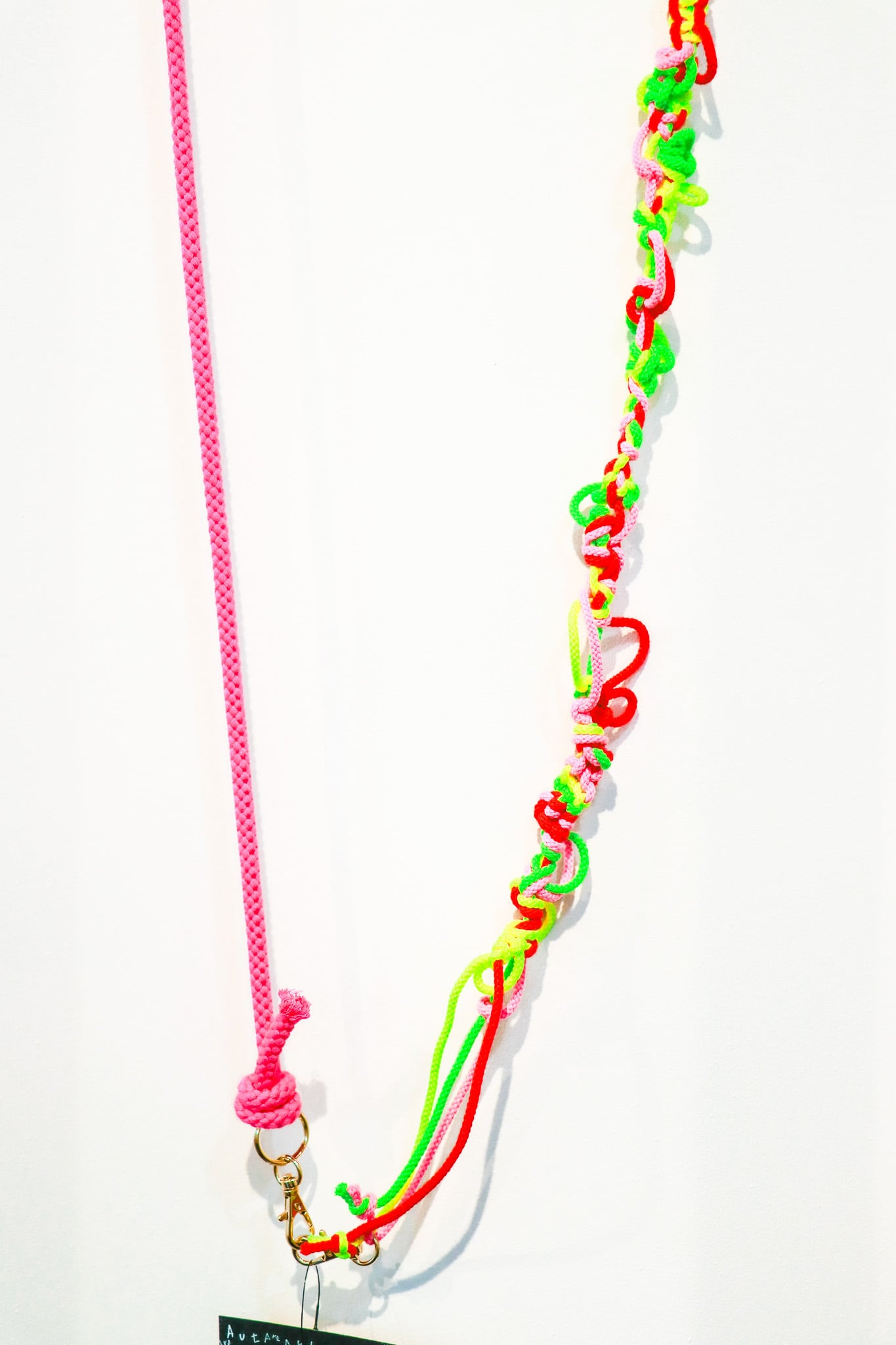 ネオンカラーの紐を組み合わせ細やかな結びやループ状の装飾が連なった