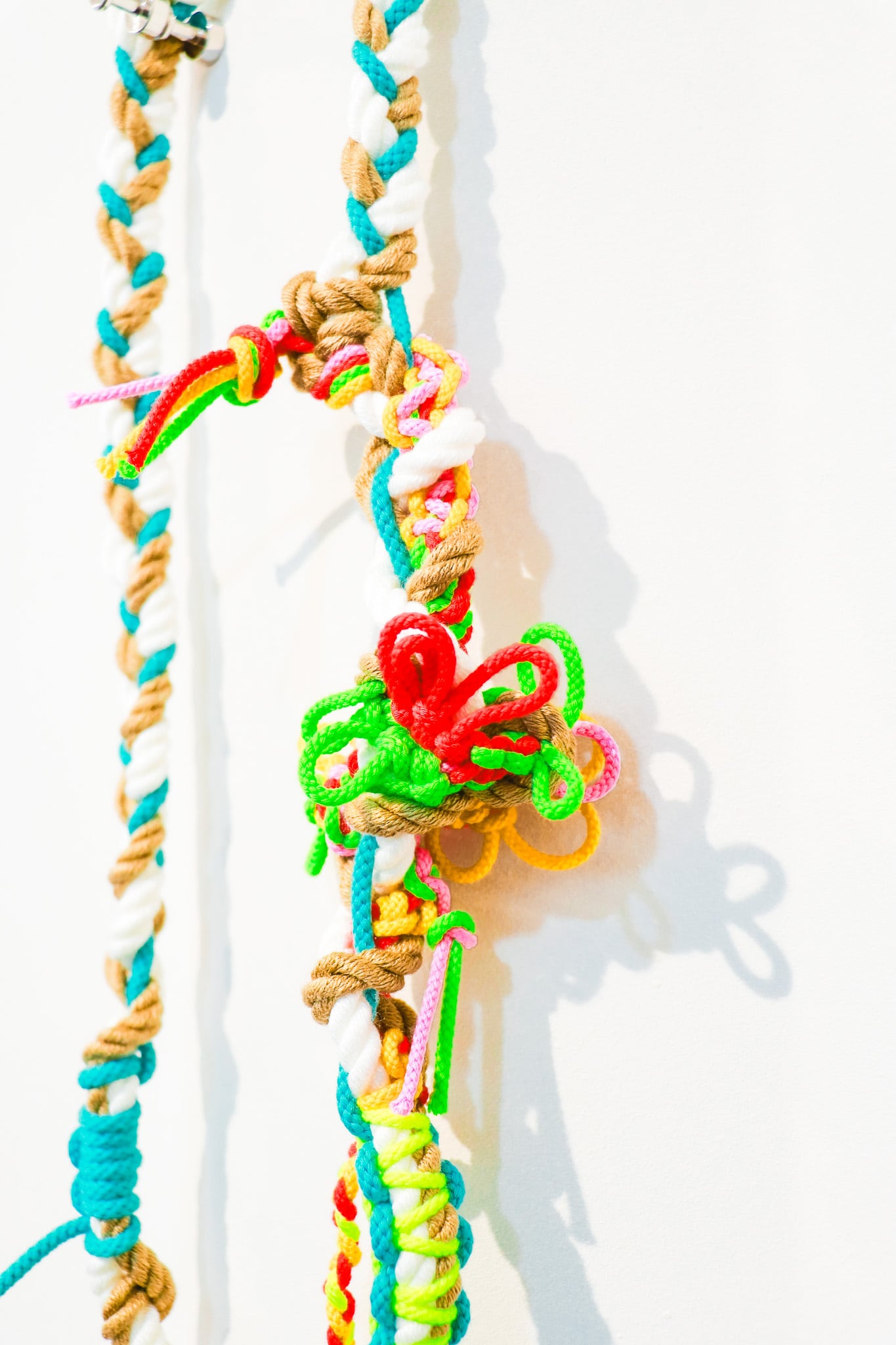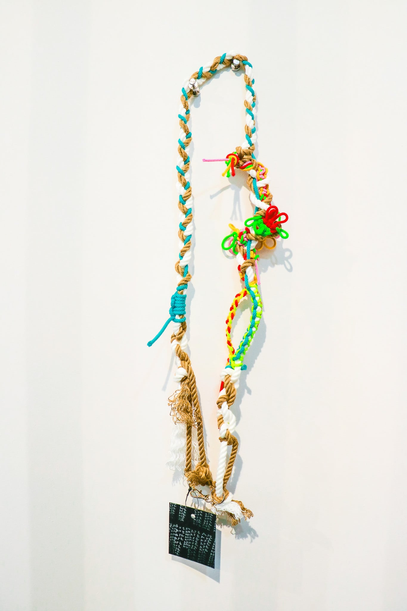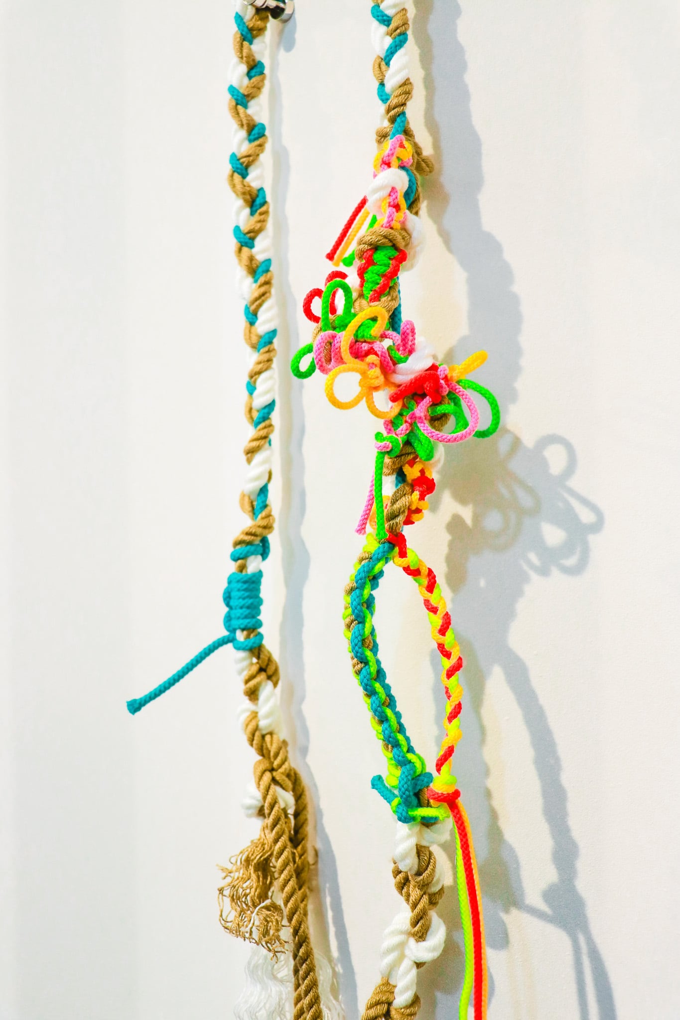 ロープ状の編み込みやフリンジ、結びのモチーフが重なり合い、ひとつの作品のような存在感。