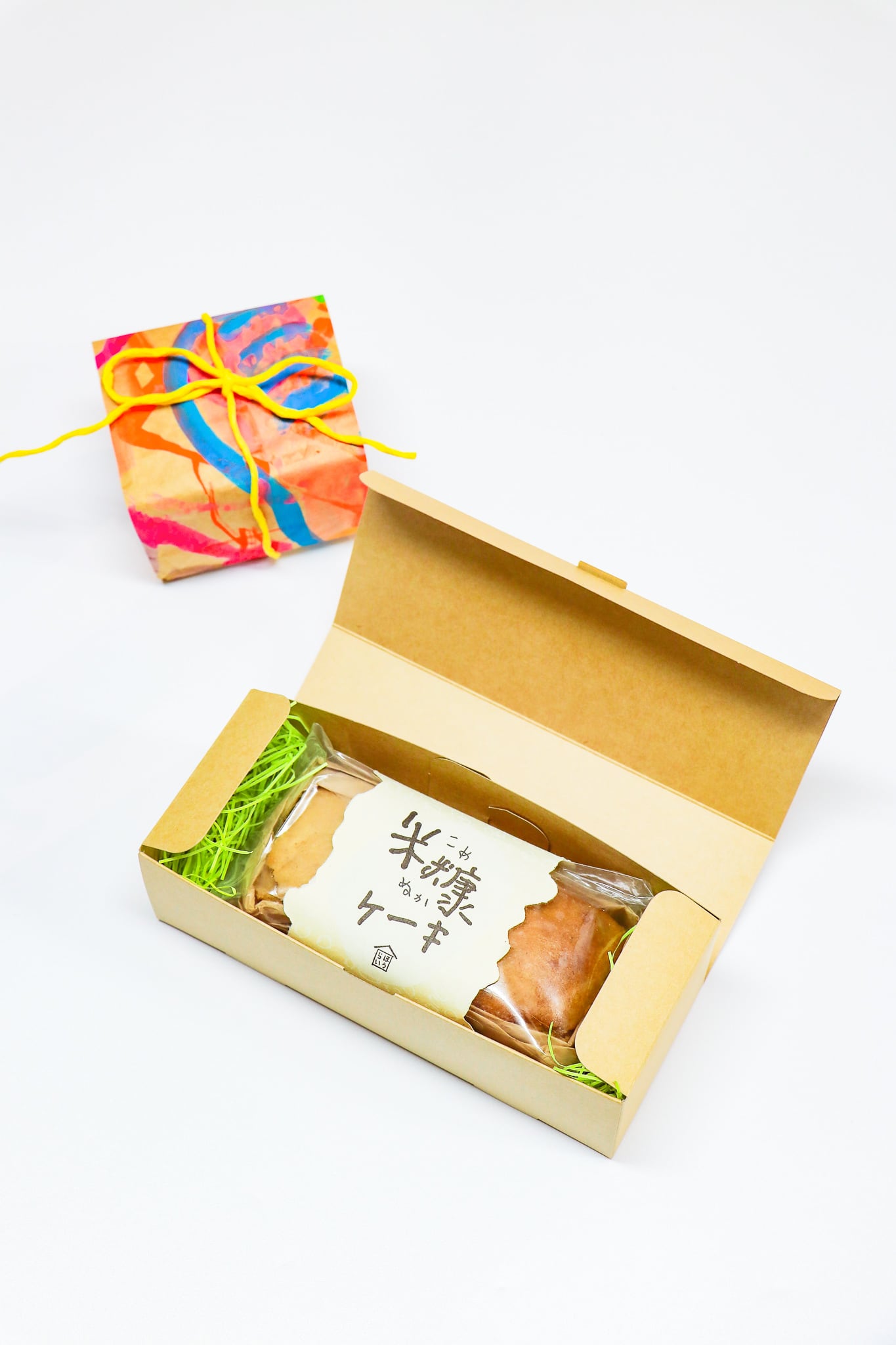 ケーキサイズの箱に巻くのはケーキにも使用している米粉の入っていた粉袋に